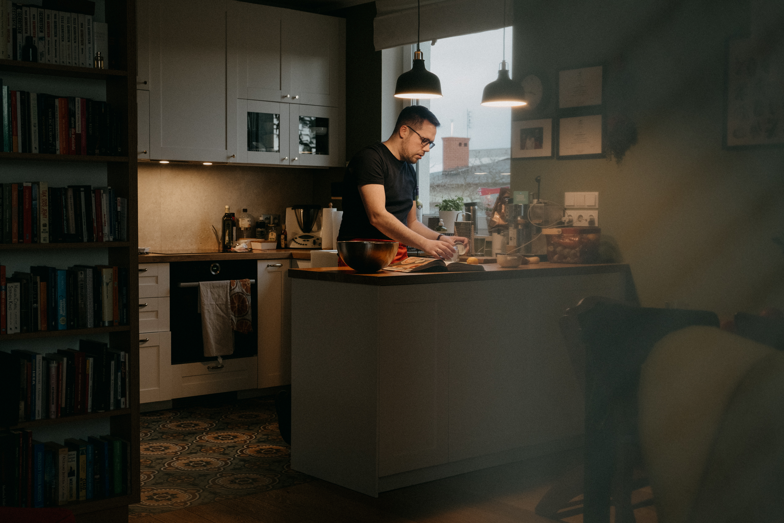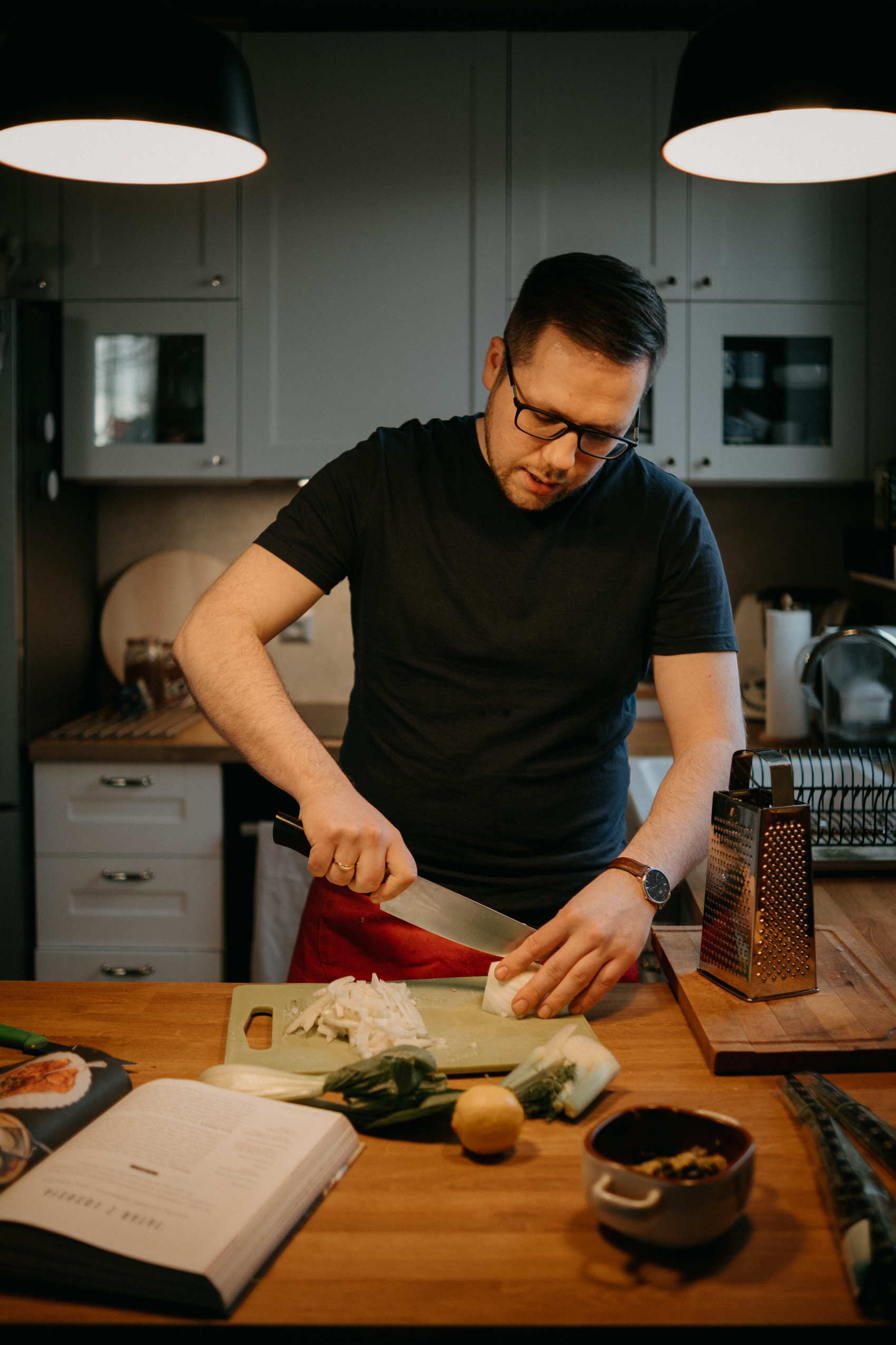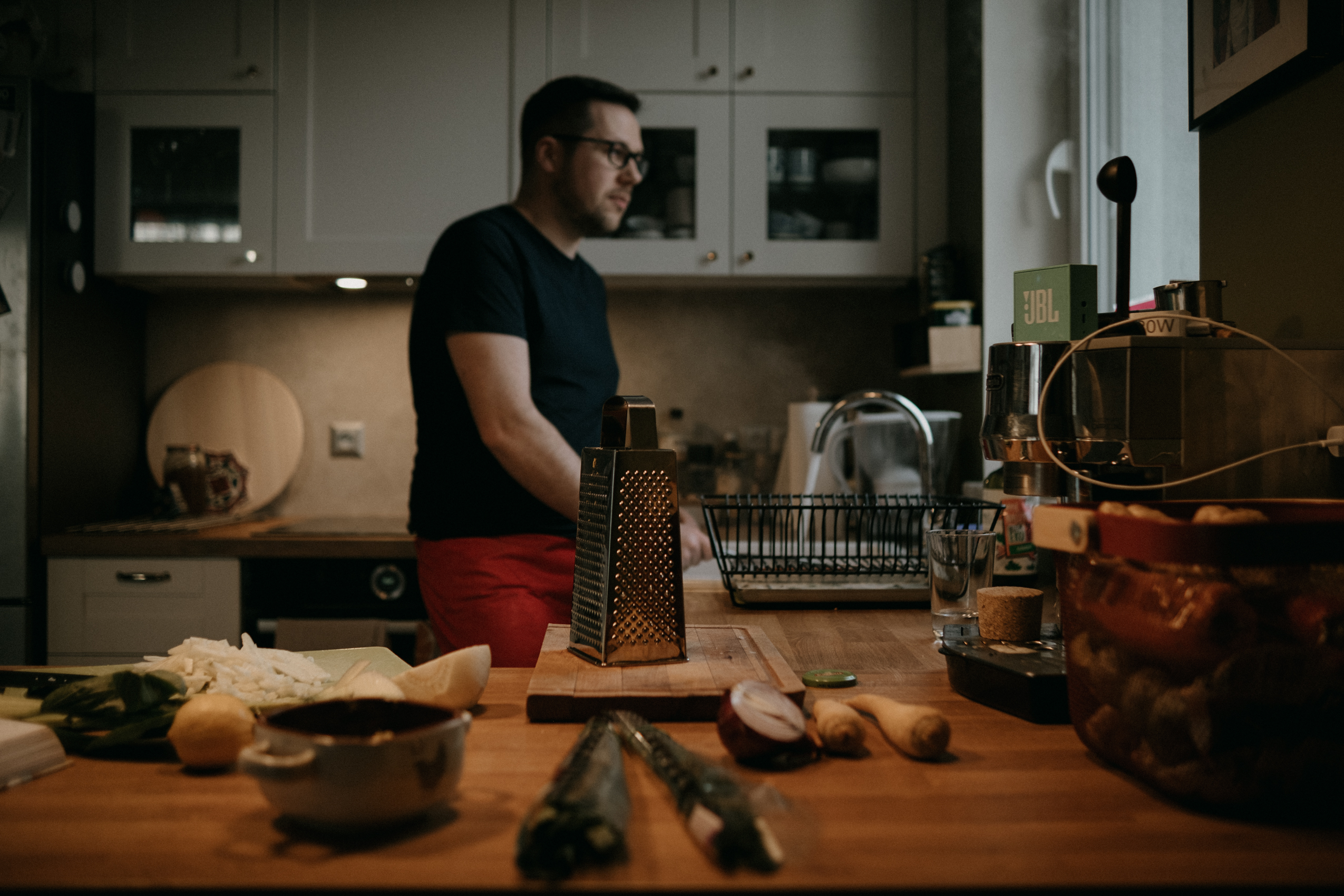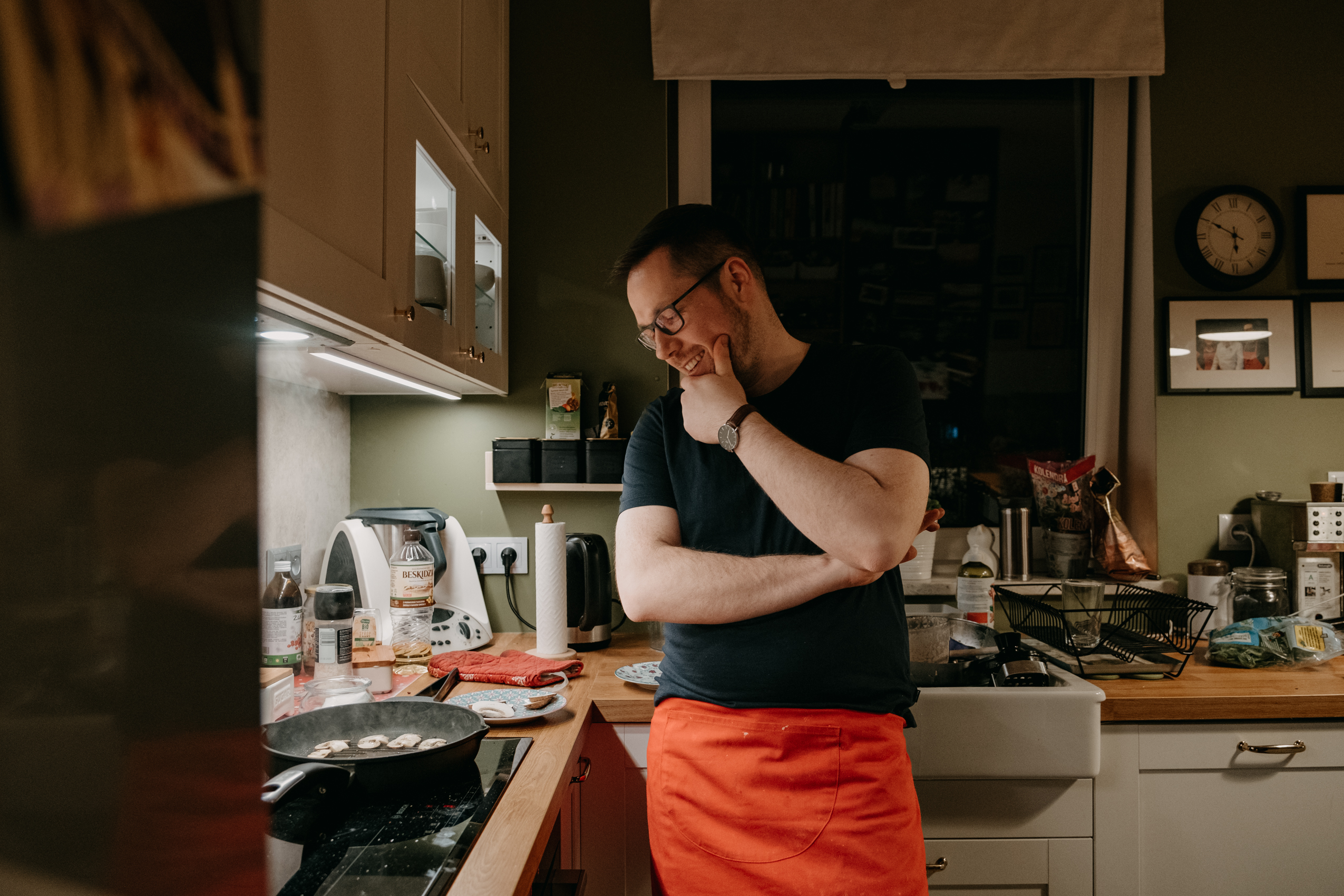 Ale najważniejsze było to, co Rafał opowiadał mi podczas gotowania. O tym, że gotowanie samo w sobie jest dla niego ogromną przyjemnością, ale to gotowanie RAZEM, czy też DLA KOGOŚ jest najważniejsze. I widać to nawet w moich kadrach. Na początku, kiedy Rodzina Rafała zostawiła nas samych w mieszkaniu, żebyśmy na spokojnie mogli zająć się projektem, Rafał był niesamowicie precyzyjny i skupiony na potrawach. Wręcz z namaszczeniem wykonywał każdy kolejny krok z przepisu Jamiego Olivera. I na pewno była to przyjemność, ale kiedy jego dziewczyny wróciły do domu, wrócił również uśmiech na jego twarzy. I pewnie, zaczął się chaos, córa zaczęła plątać się pod nogami, ale gołym okiem było widać, że to gotowanie nabrało większego sensu.