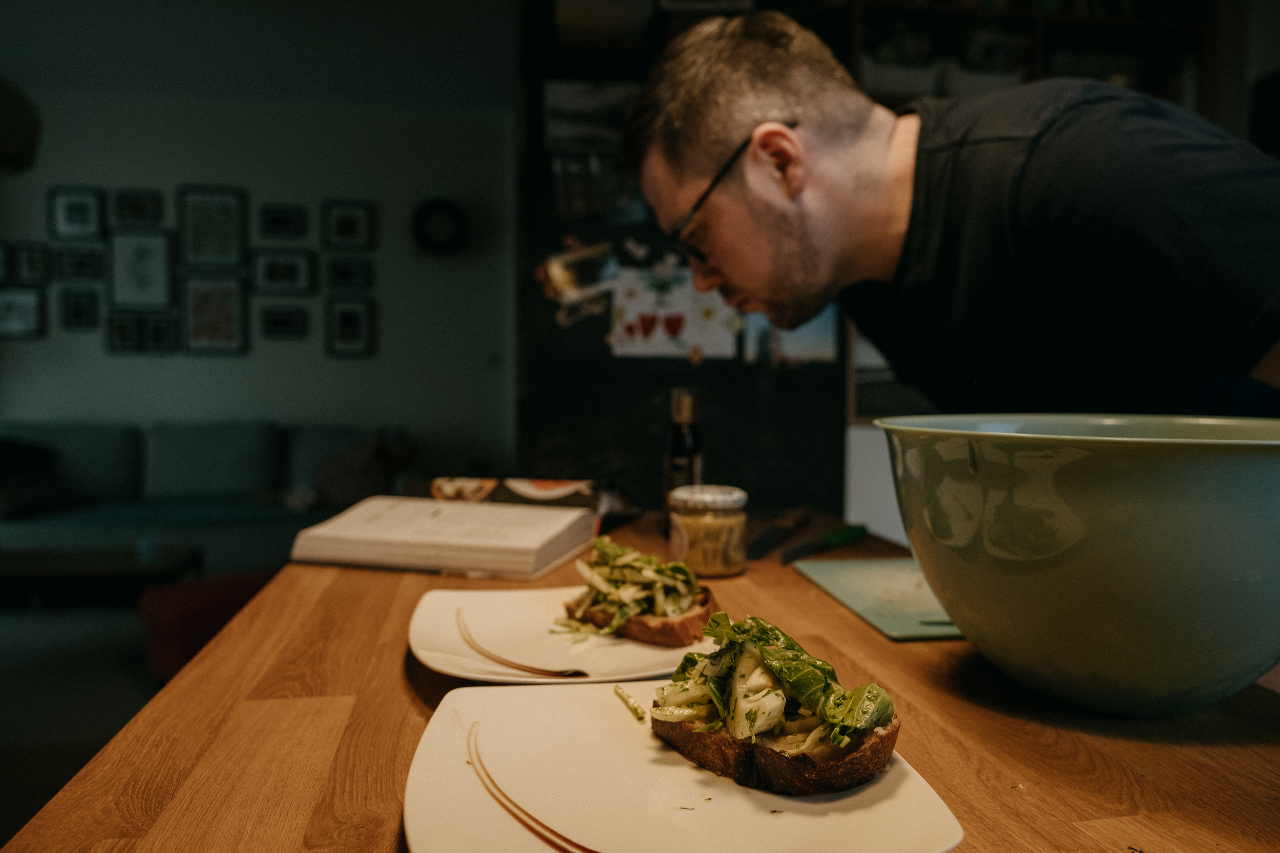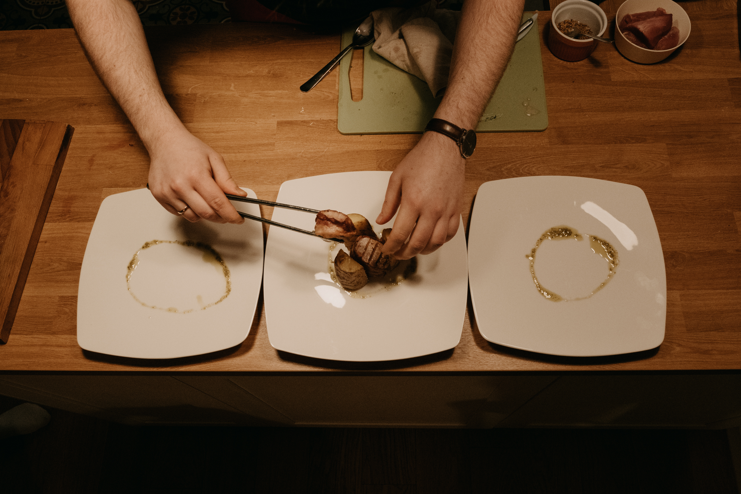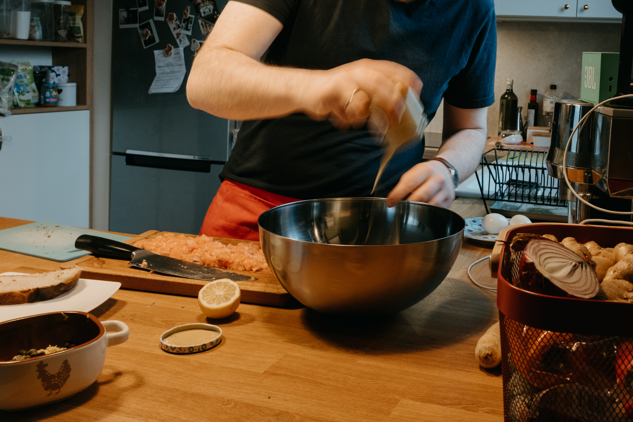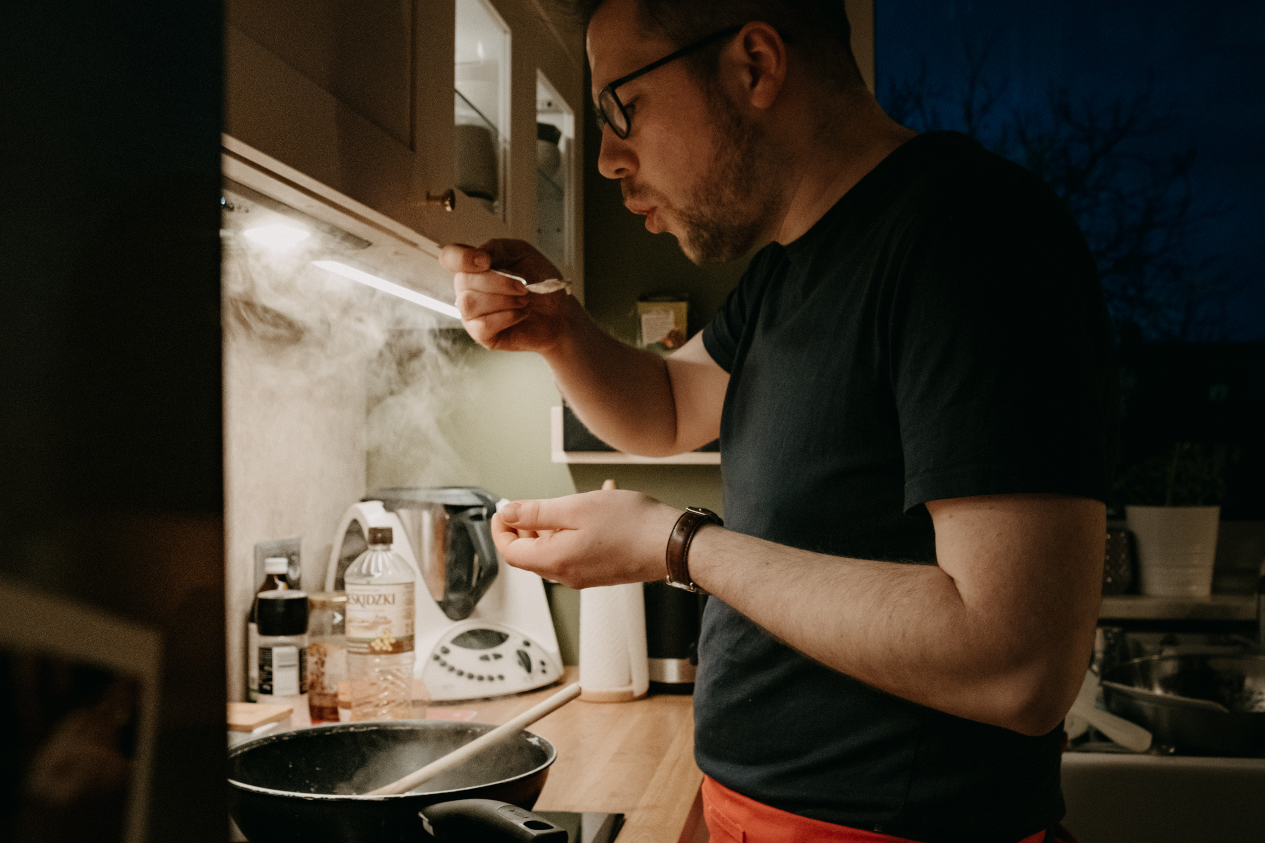 Ale najważniejsze było to, co Rafał opowiadał mi podczas gotowania. O tym, że gotowanie samo w sobie jest dla niego ogromną przyjemnością, ale to gotowanie RAZEM, czy też DLA KOGOŚ jest najważniejsze. I widać to nawet w moich kadrach. Na początku, kiedy Rodzina Rafała zostawiła nas samych w mieszkaniu, żebyśmy na spokojnie mogli zająć się projektem, Rafał był niesamowicie precyzyjny i skupiony na potrawach. Wręcz z namaszczeniem wykonywał każdy kolejny krok z przepisu Jamiego Olivera. I na pewno była to przyjemność, ale kiedy jego dziewczyny wróciły do domu, wrócił również uśmiech na jego twarzy. I pewnie, zaczął się chaos, córa zaczęła plątać się pod nogami, ale gołym okiem było widać, że to gotowanie nabrało większego sensu.