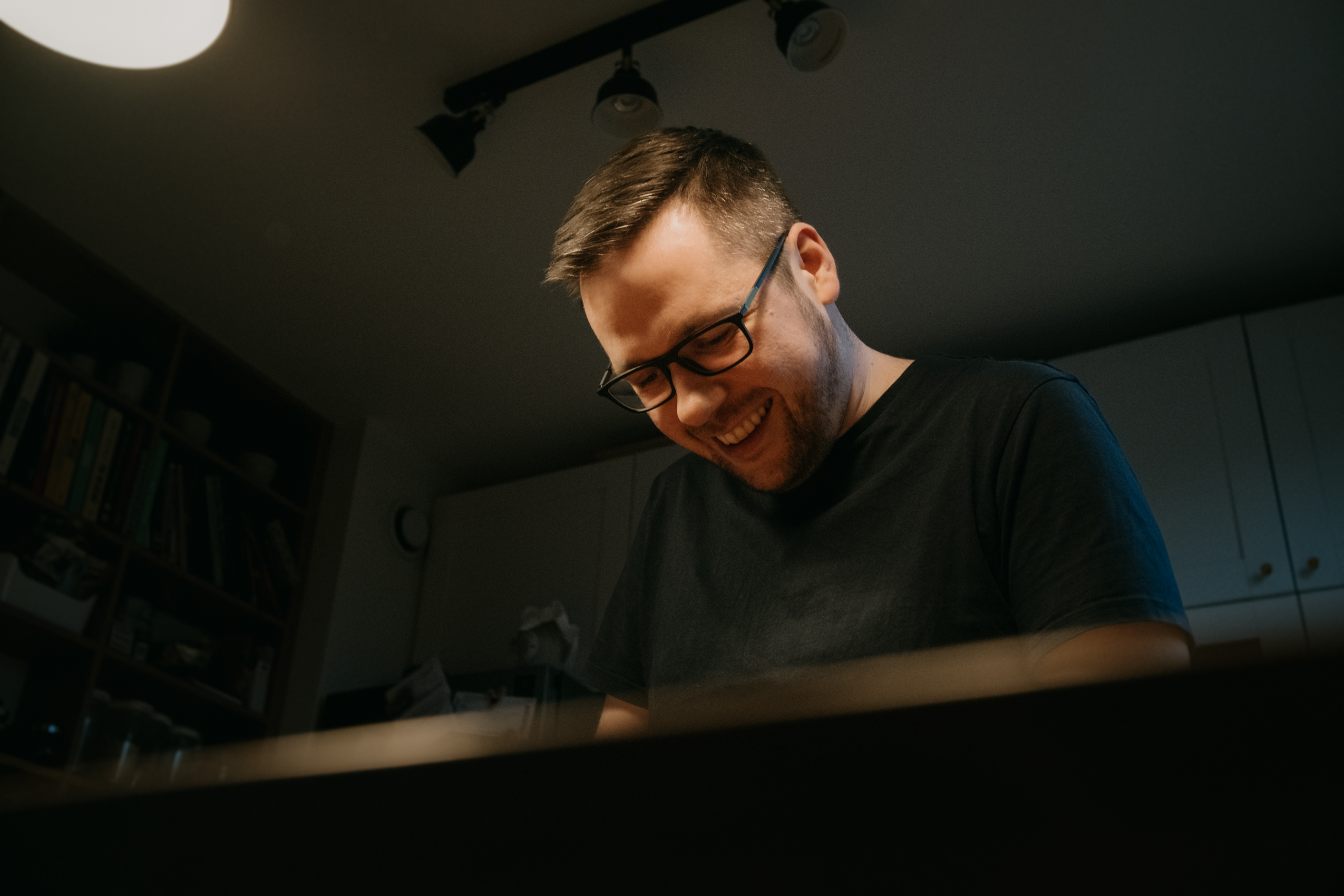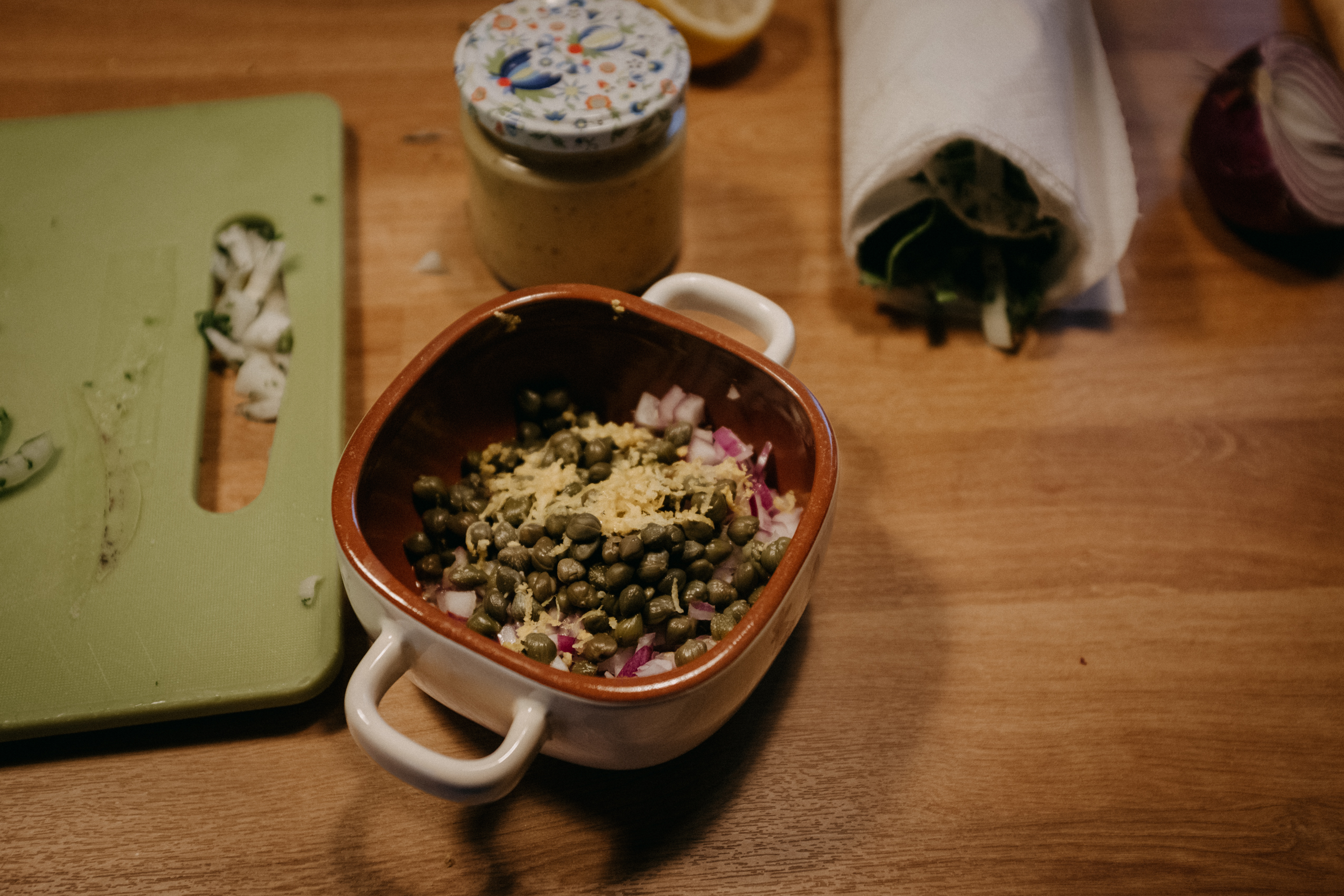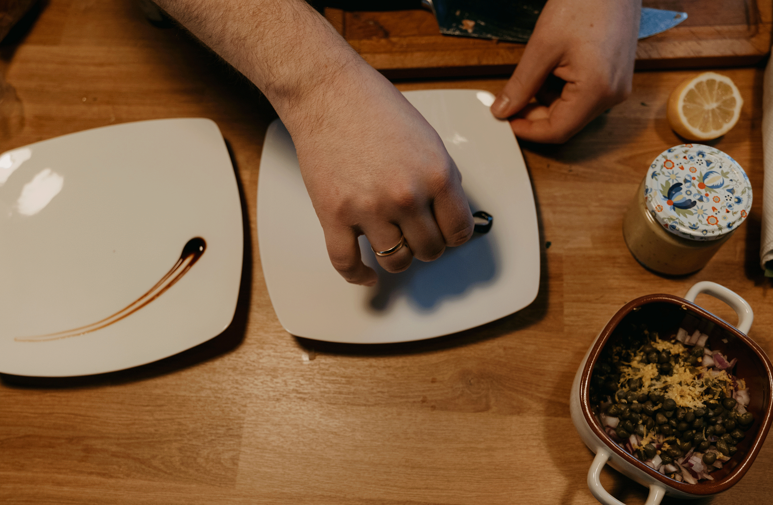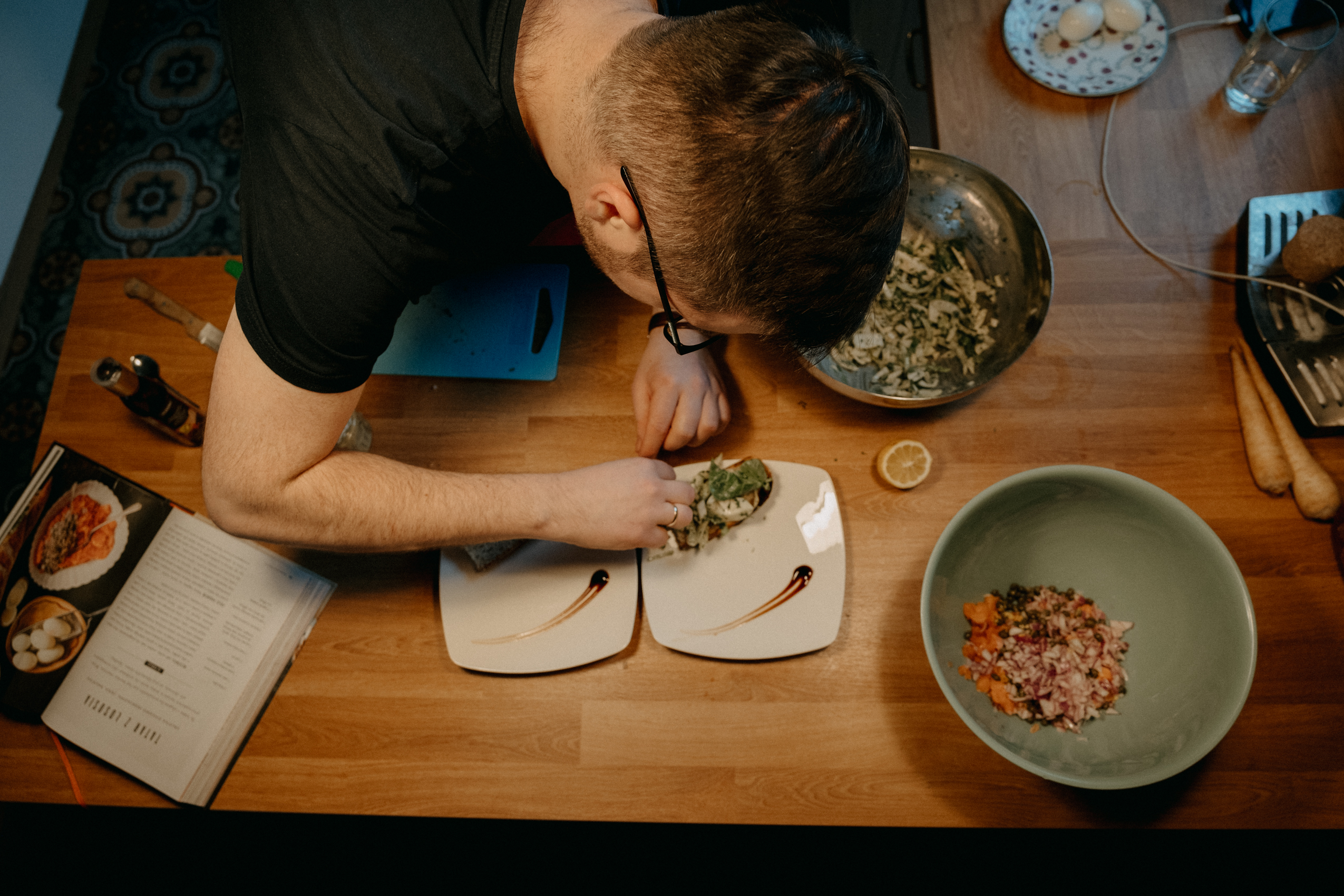 Ale najważniejsze było to, co Rafał opowiadał mi podczas gotowania. O tym, że gotowanie samo w sobie jest dla niego ogromną przyjemnością, ale to gotowanie RAZEM, czy też DLA KOGOŚ jest najważniejsze. I widać to nawet w moich kadrach. Na początku, kiedy Rodzina Rafała zostawiła nas samych w mieszkaniu, żebyśmy na spokojnie mogli zająć się projektem, Rafał był niesamowicie precyzyjny i skupiony na potrawach. Wręcz z namaszczeniem wykonywał każdy kolejny krok z przepisu Jamiego Olivera. I na pewno była to przyjemność, ale kiedy jego dziewczyny wróciły do domu, wrócił również uśmiech na jego twarzy. I pewnie, zaczął się chaos, córa zaczęła plątać się pod nogami, ale gołym okiem było widać, że to gotowanie nabrało większego sensu.